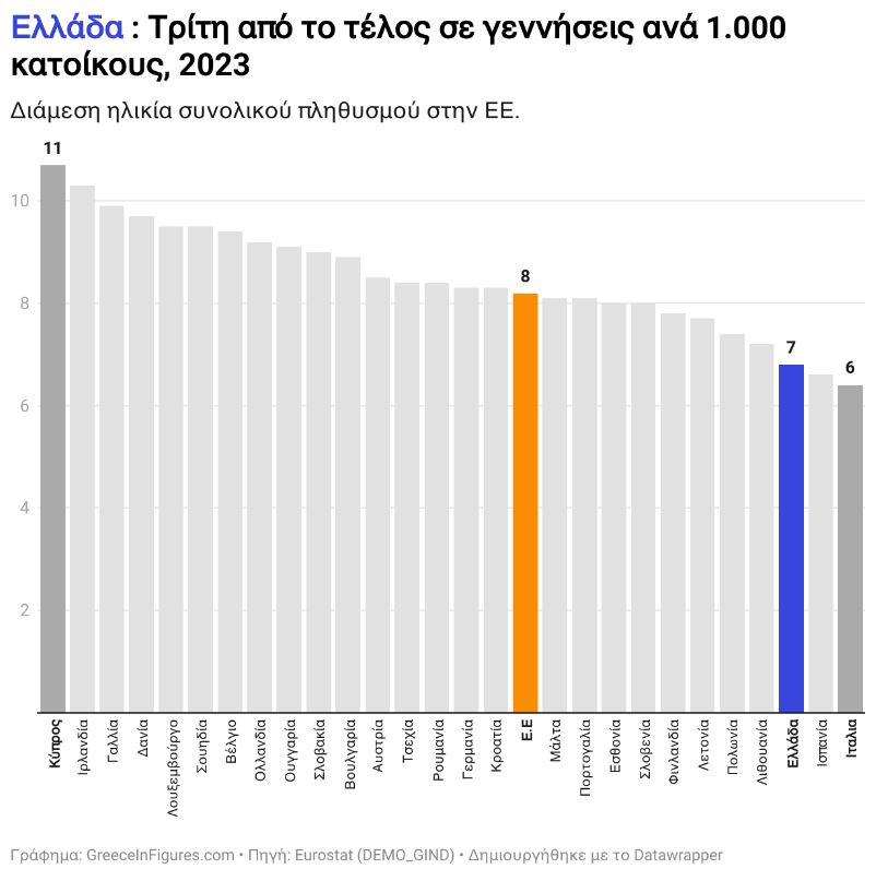 Το 2023, η Ελλάδα καταγράφει έναν από τους χαμηλότερους δείκτες γεννήσεων στην Ευρωπαϊκή Ένωση, με 6,8 γεννήσεις ανά 1.000 κατοίκους, κάτω από τον μέσο όρο της Ε.Ε. που είναι 8,2. Χώρες όπως η Ιταλία (6,4) και η Ισπανία (6,6) παρουσιάζουν ακόμα χαμηλότερα ποσοστά, ενώ αντίθετα η Κύπρος (10,7), η Ιρλανδία (10,3) και η Γαλλία (9,9) βρίσκονται στις πρώτες θέσεις στην Ε.Ε.